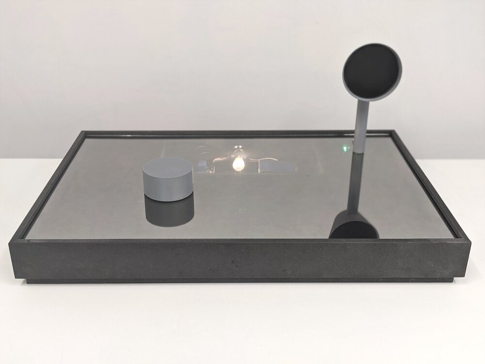 Radio-Tuner-Thing is an experimental radio artefact developed in collaboration with Anthony Forsyth. The device accesses a large directory of online radio stations via the Shoutcast API, selecting from tens of thousands of available streams. Rather than presenting stations through a digital interface, tuning is achieved using a single dial that navigates an invisible landscape of listening zones. These zones are mapped as circular regions across the tuning surface. Clear audio is only available at the centre of each zone, while movement between zones produces static. This creates a tactile and exploratory tuning experience that resists direct selection and foregrounds uncertainty and discovery. To introduce constraint within this randomness, the system incorporates time as a governing parameter. Available stations shift throughout the day according to global time zones, resetting to a home location at midday. As the day progresses, listeners encounter stations from increasingly distant locations.