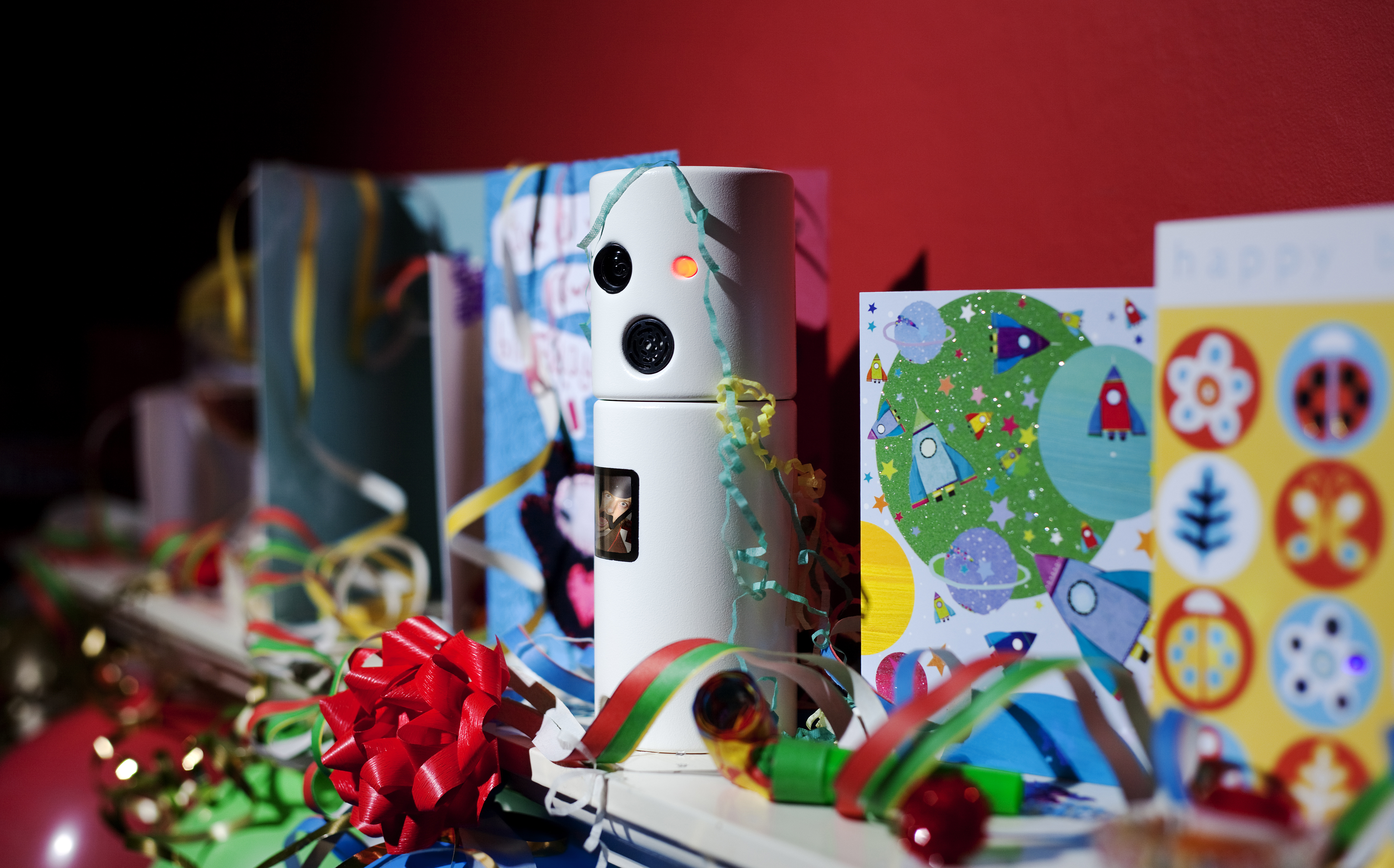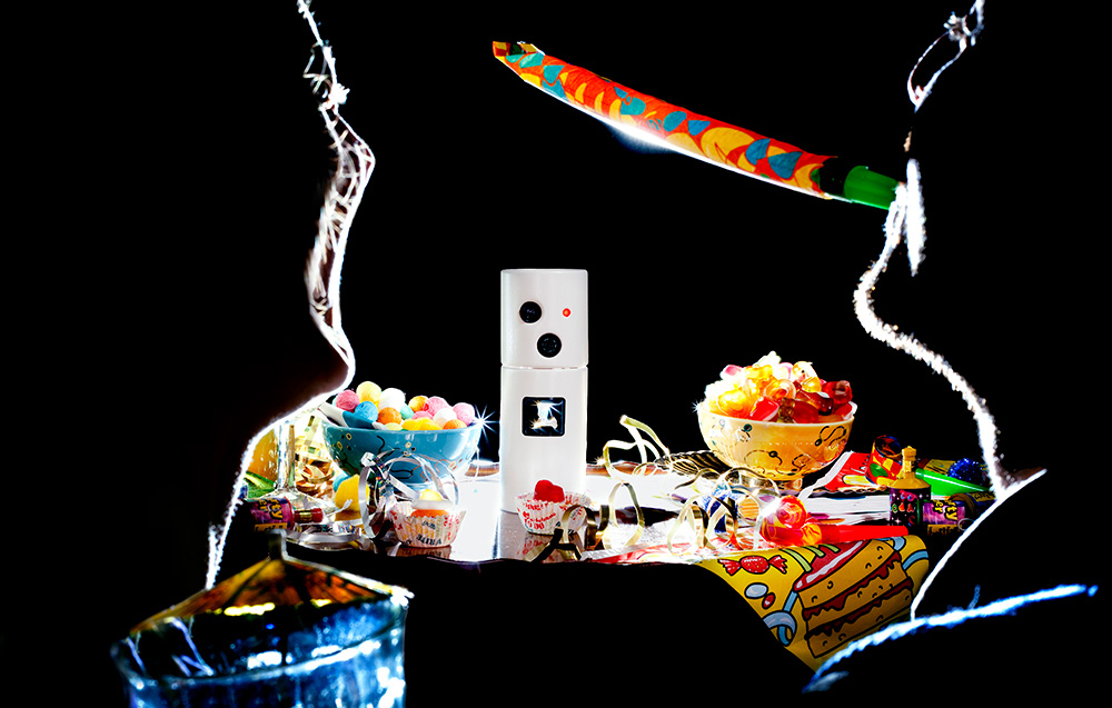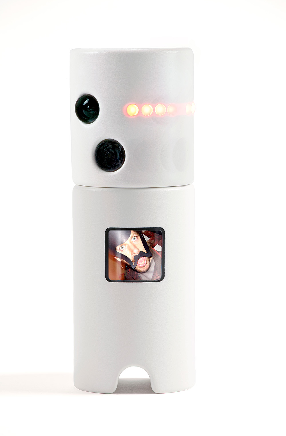 PhotoBot is a party camera designed to initiate image capture autonomously within social settings. The device responds to movement and environmental change, periodically scanning its surroundings to record moments of activity. Anthropomorphic features were incorporated to frame this behaviour as playful rather than surveillant, with the camera visibly glancing around the room rather than remaining static. A built-in display allows people to preview images as they are captured, making the act of photographing visible and open to negotiation. In use, this visibility often prompted playful interaction, with participants responding to the camera’s movements and inviting it to take their photograph.