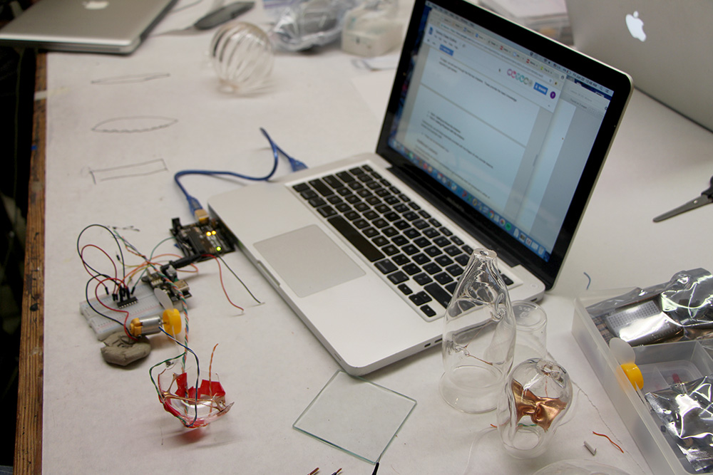 This two-week intensive workshop at Pilchuck Glass School with Mark Hursty (University of North Carolina) explored how glass artists might integrate digital materials, circuits, and sensing technologies directly into hot glass processes. The project investigated the incorporation of conductive metals and smart pigments into glass blowing and casting, examining glass as a potential sensing material rather than a passive form. Participants were introduced to Arduino and Processing to support the development of interactive artefacts combining glass, embedded electronics, and screen-based media. The workshop formed part of ongoing research at Northumbria University and Sunderland University examining glass within Internet of Things (IoT) contexts.