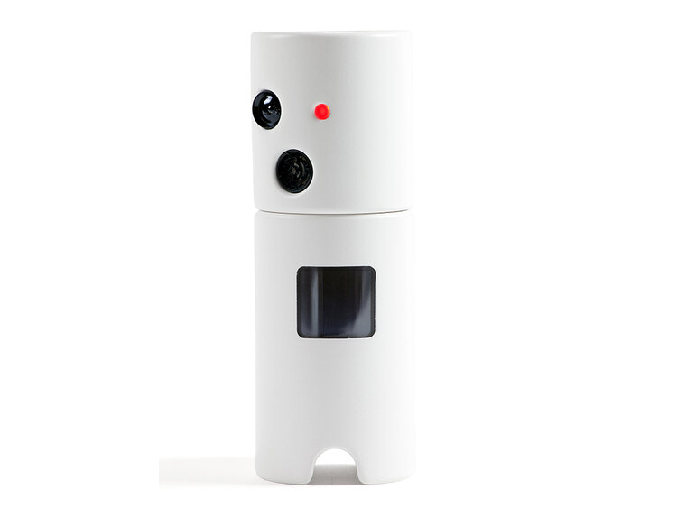 PhotoBot is a party camera designed to initiate image capture autonomously within social settings. The device responds to movement and environmental change, periodically scanning its surroundings to record moments of activity. Anthropomorphic features were incorporated to frame this behaviour as playful rather than surveillant, with the camera visibly glancing around the room rather than remaining static. A built-in display allows people to preview images as they are captured, making the act of photographing visible and open to negotiation. In use, this visibility often prompted playful interaction, with participants responding to the camera’s movements and inviting it to take their photograph.